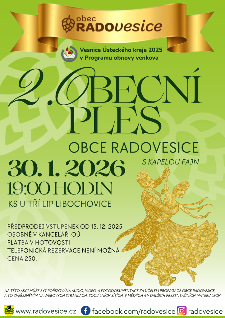 Obec Radovesice vás zve na v pořadí 2. obecní ples, který se koná 30. ledna 2026 od 19:00 hodin v Kulturním středisku U Tří lip v Libochovicích. Vstupenky jsou k dispozici od 15. prosince 2025 osobně v kanceláři obce. Platba je možná pouze v hotovosti, telefonické rezervace nejsou možné. Cena vstupenky je 250 Kč.